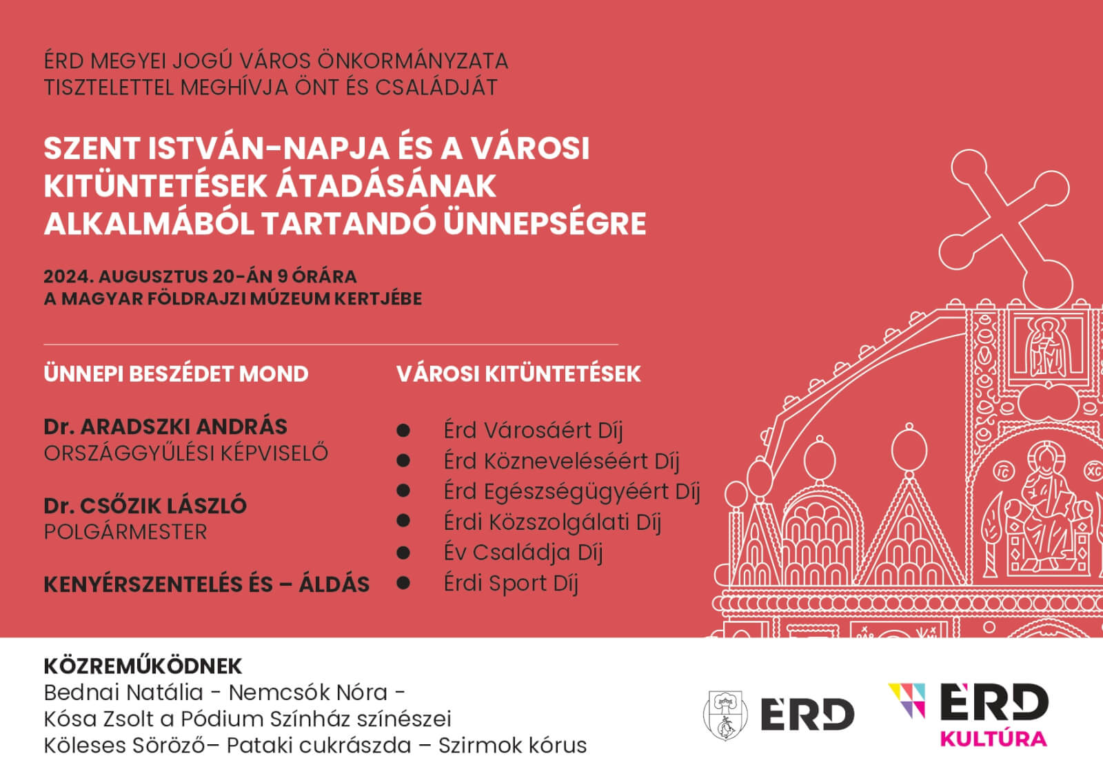 Érd megyei jogú város önkormányzata tisztelettel meghívja önt és családját Szent István-napja és a városi kitűntetések átadásának alkalmából tartandó ünnepségre 2024. augusztus 20.-án 9 órára a Magyar Földrajzi Múzeum kertjébe.